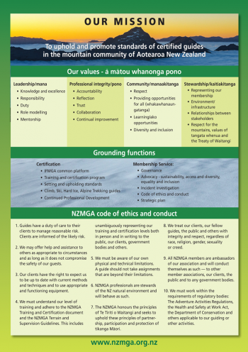 The New Zealand Mountain Guides Association (NZMGA) is an internationally recognised non-profit Professional Industry Association servicing the standards and competency needs of mountain guides and the tourism operators they work for. The NZMGA regulates the quality of guiding through its training…